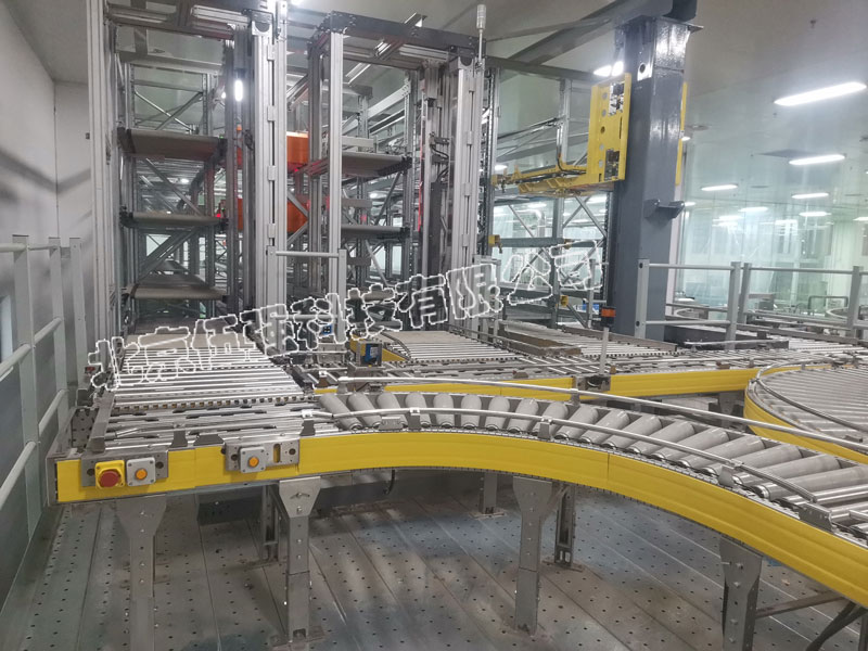 四向穿梭車系統(tǒng)通過箱式輸送線將整件貨物從二樓通過螺旋提升機送到一樓高速分揀機,通過分揀系統(tǒng)分配每個訂單出口。