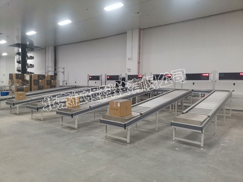 電子標簽揀選作業(yè)區(qū)作為將來貨到人自動揀選系統(tǒng)的過渡,設置有3組流利貨架,拆零商品通過電子標簽揀選后放到指定的播種車上完成不同商品的分類。工作人員將播種車推到附近的打包復核區(qū)進行打包,打包后的紙箱通過箱式輸送線到一樓分揀機分揀。