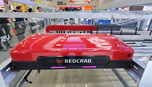 伍強科技展出的兩款新產(chǎn)品,其一是彎道型雙向穿梭車,其二是大尺度自適應(yīng)四向穿梭車。